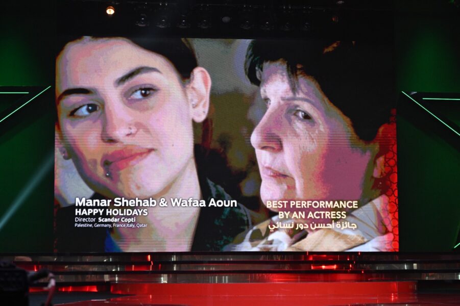 أحسن دور نسائي: الممثلتان الفلسطينيتان منار شهاب ووفاء عون عن دورهما في فيلم “ينعاد عليكو”.